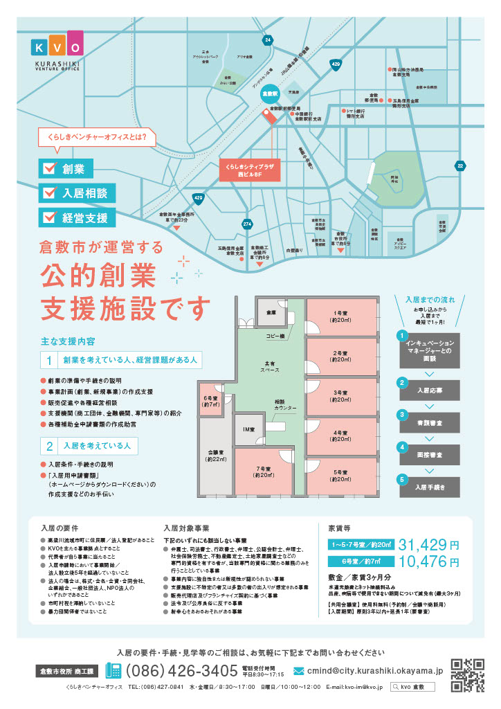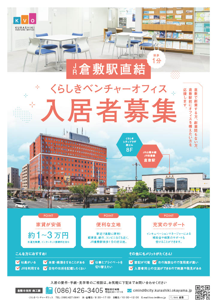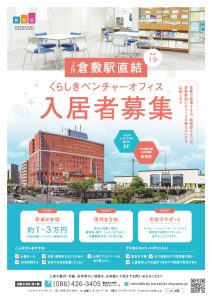 創業間もない方、あなたの夢を倉敷駅前で実現させませんか? ●安い 家賃は約3万1千円(20㎡)。水道光熱費、ネット接続料を含む。 ●便利 JR倉敷駅から徒歩1分。近くに銀行、郵便局、コンビニあり ●信頼 倉敷市が運営する公的施設。専任マネージャー在席(水・金の8時30分~17時30分、日の10時~12時)